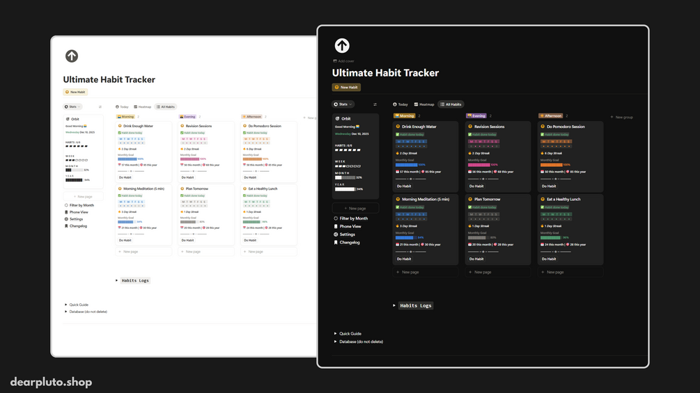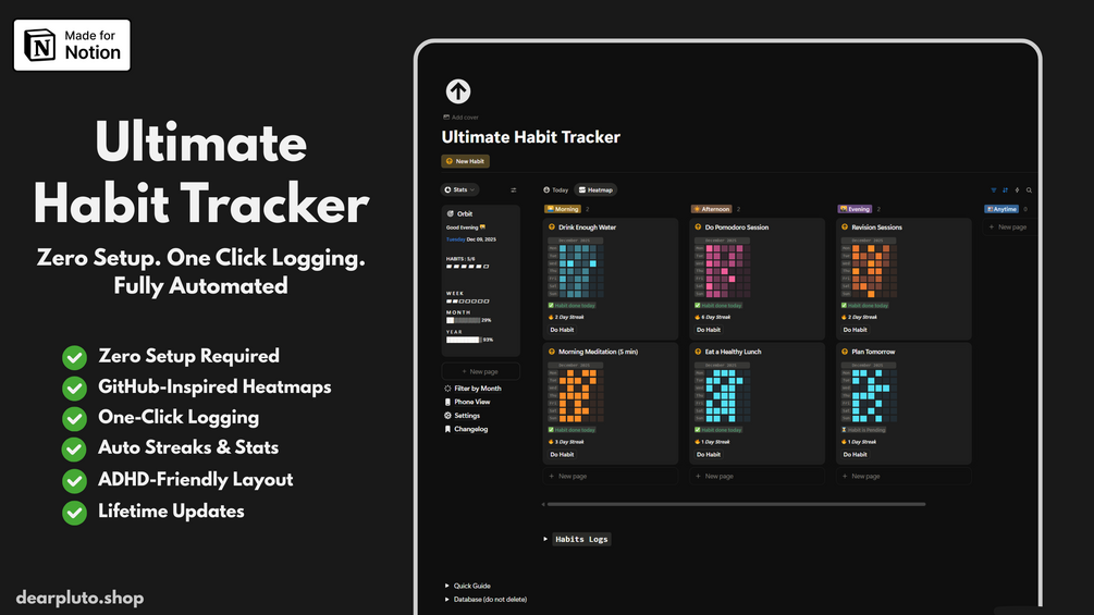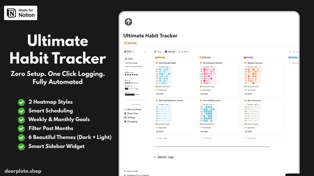 The Ultimate Habit Tracker is designed for people who want the cleanest, smartest and most aesthetic habit system ever built on Notion. Zero setup. One click to log. Everything else runs automatically in the background.